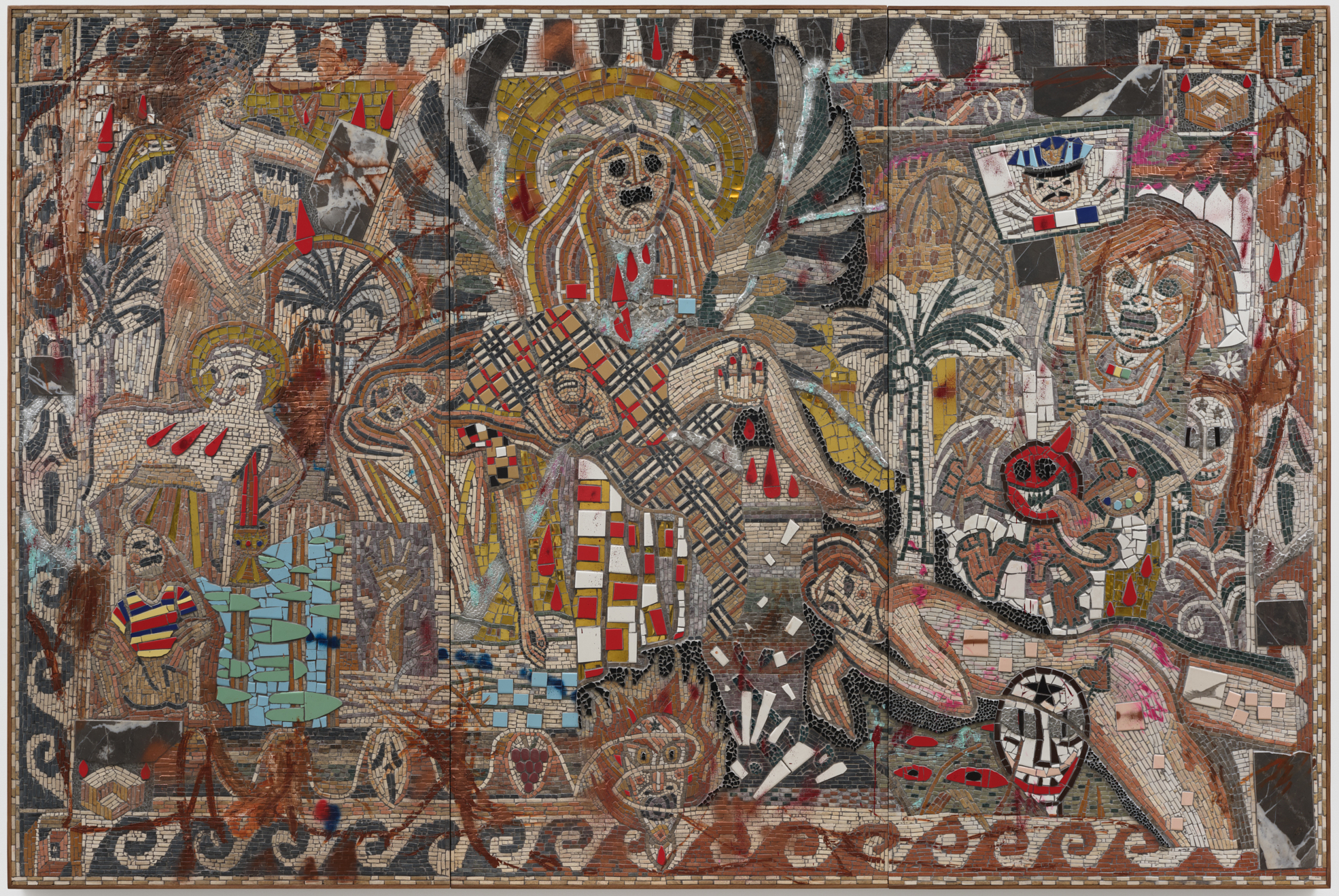 MARBLE, GLASS, CERAMIC, STONE, SPRAY ENAMEL, OIL AND ACRYLIC ON PANEL IN ARTIST FRAME