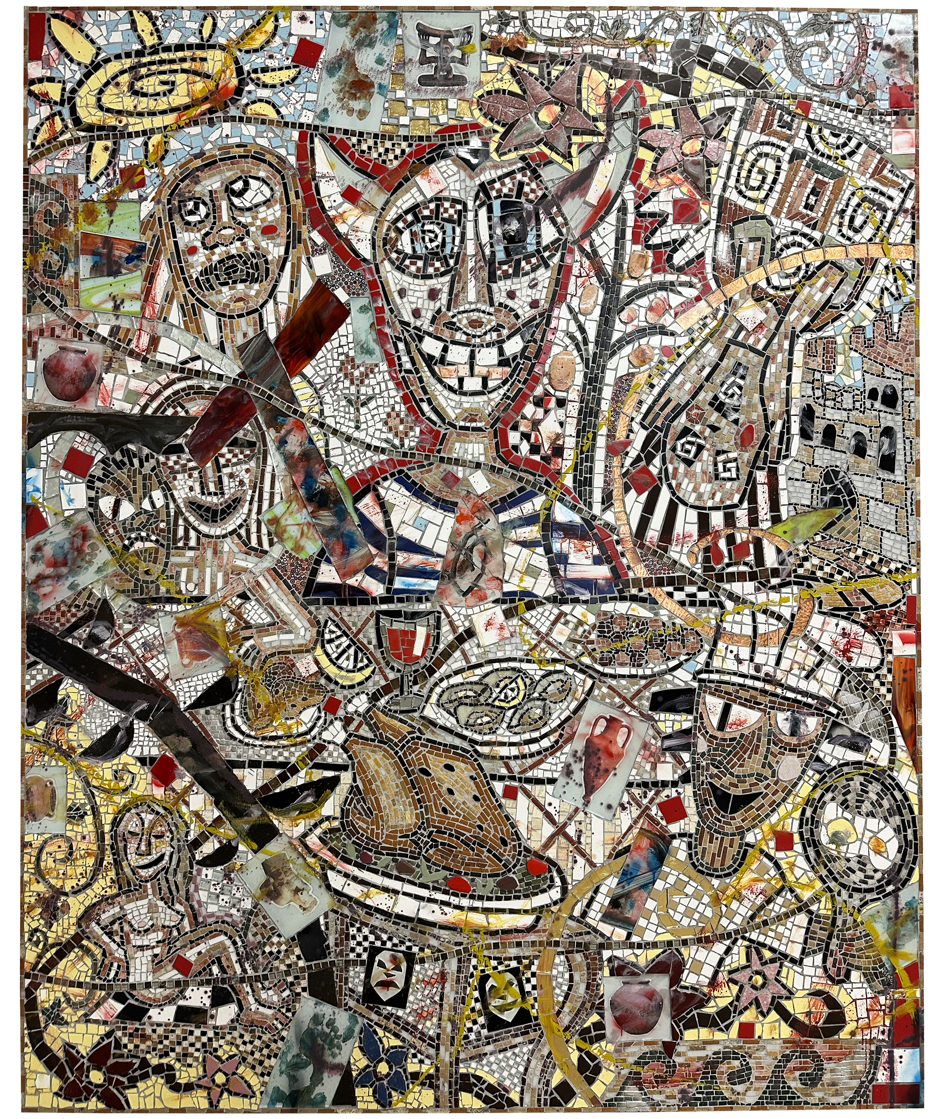 MARBLE, GLASS, CERAMIC, STONE, SPRAY ENAMEL, OIL AND ACRYLIC ON PANEL IN ARTIST FRAME