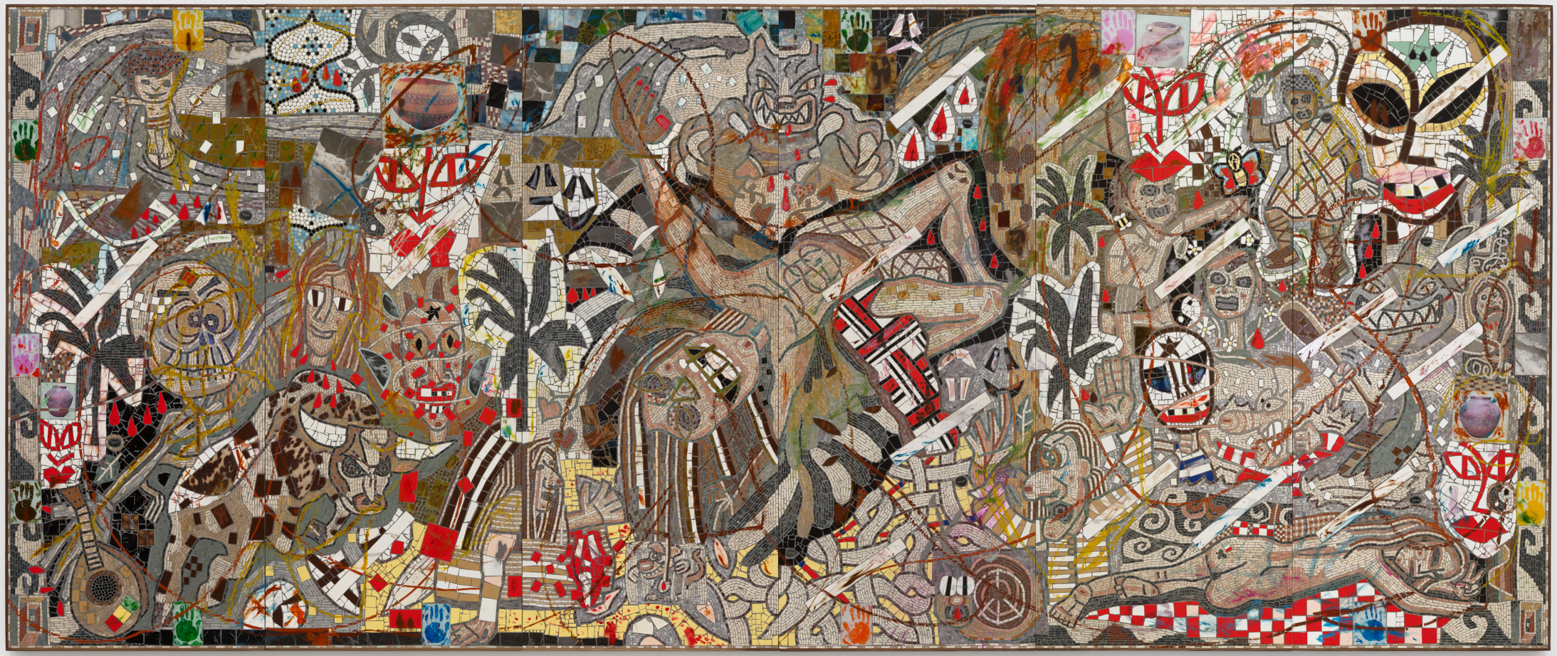 MARBLE, GLASS, CERAMIC, STONE, SPRAY ENAMEL, OIL AND ACRYLIC ON PANEL IN ARTIST FRAME