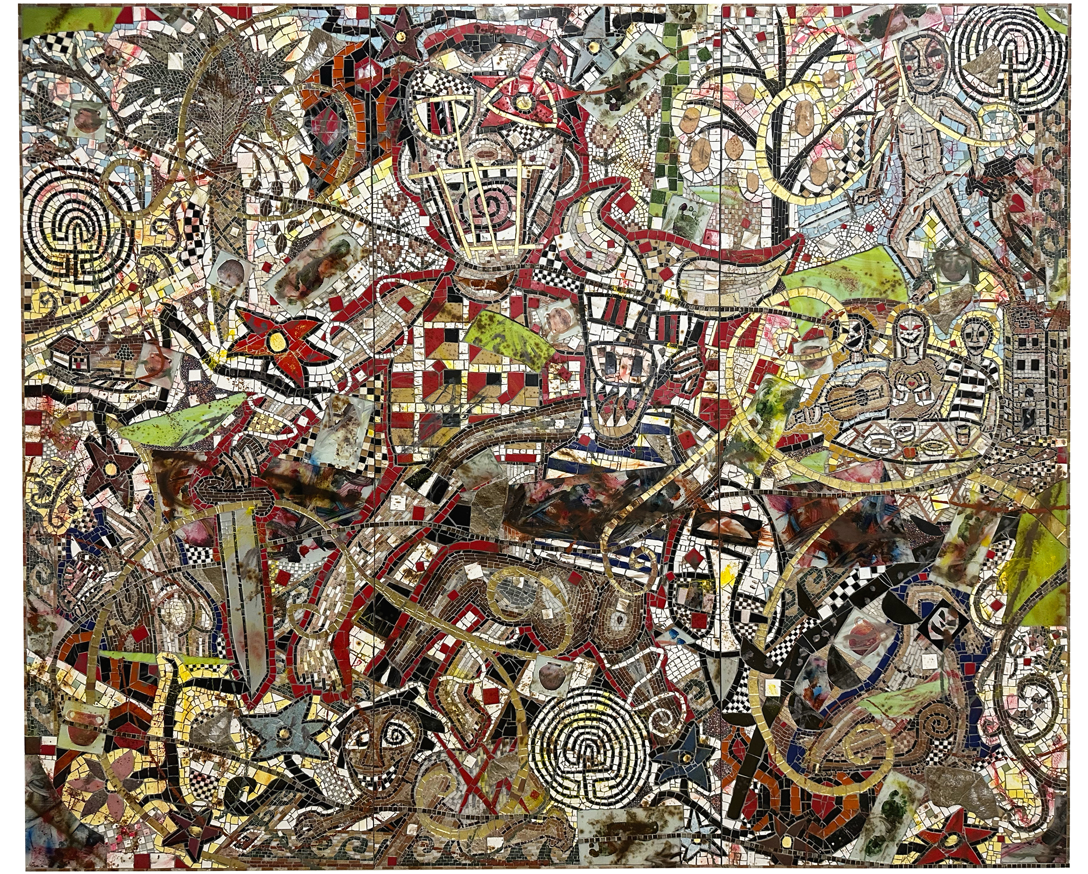 MARBLE, GLASS, CERAMIC, STONE, SPRAY ENAMEL, OIL AND ACRYLIC ON PANEL IN ARTIST FRAME