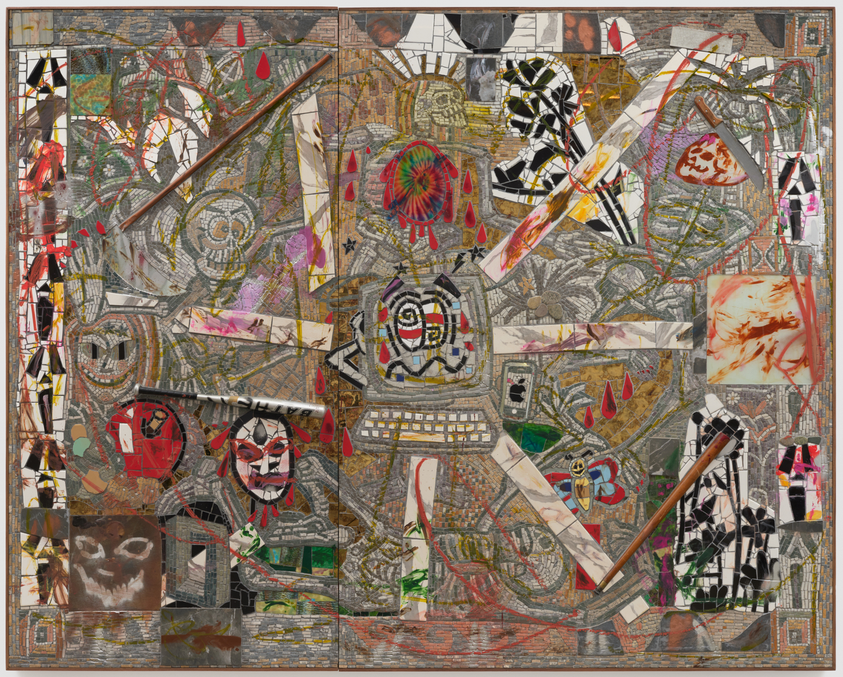 MARBLE, GLASS, CERAMIC, STONE, SPRAY ENAMEL, OIL AND ACRYLIC ON PANEL IN ARTIST FRAME