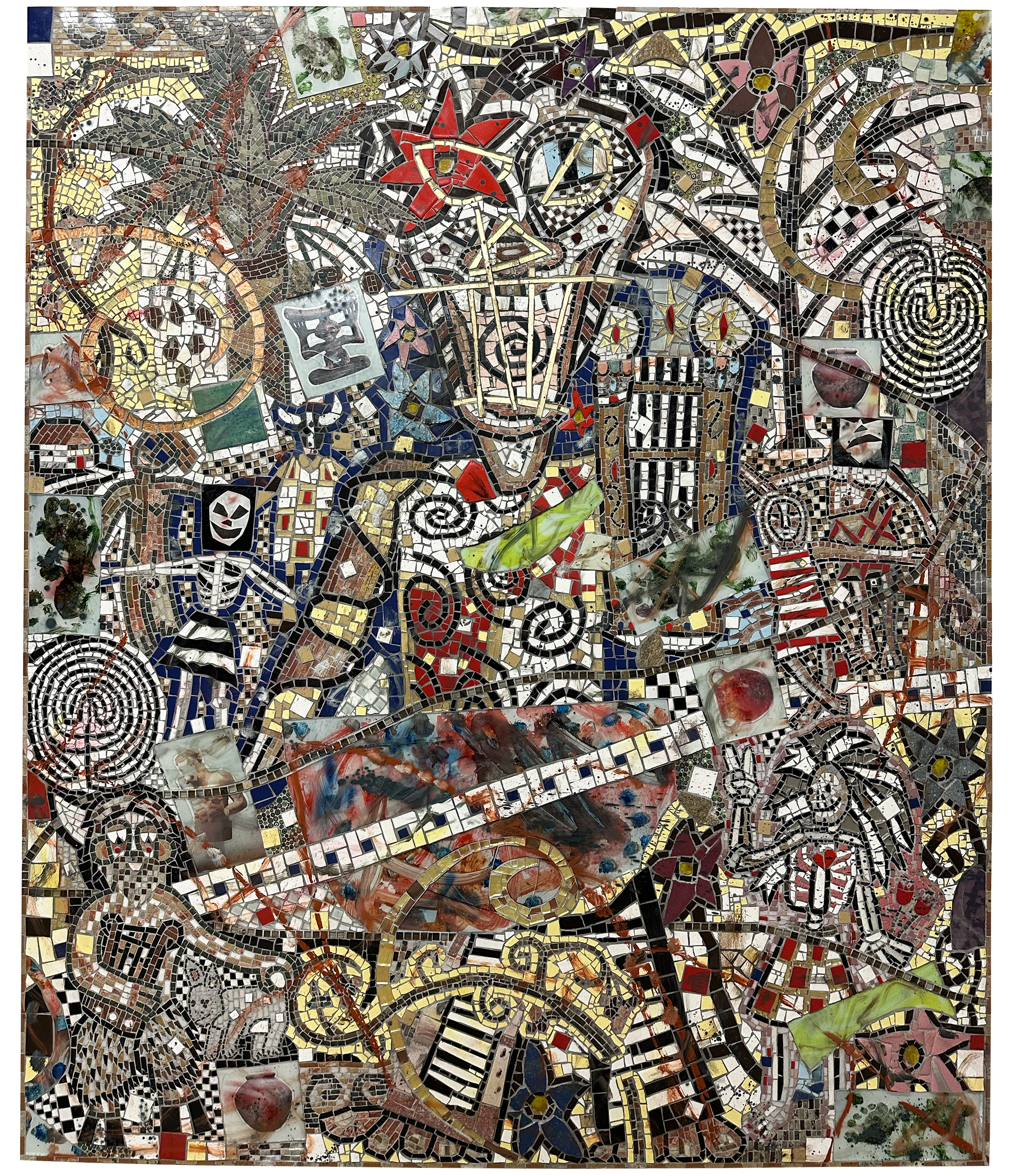 MARBLE, GLASS, CERAMIC, STONE, SPRAY ENAMEL, OIL AND ACRYLIC ON PANEL IN ARTIST FRAME