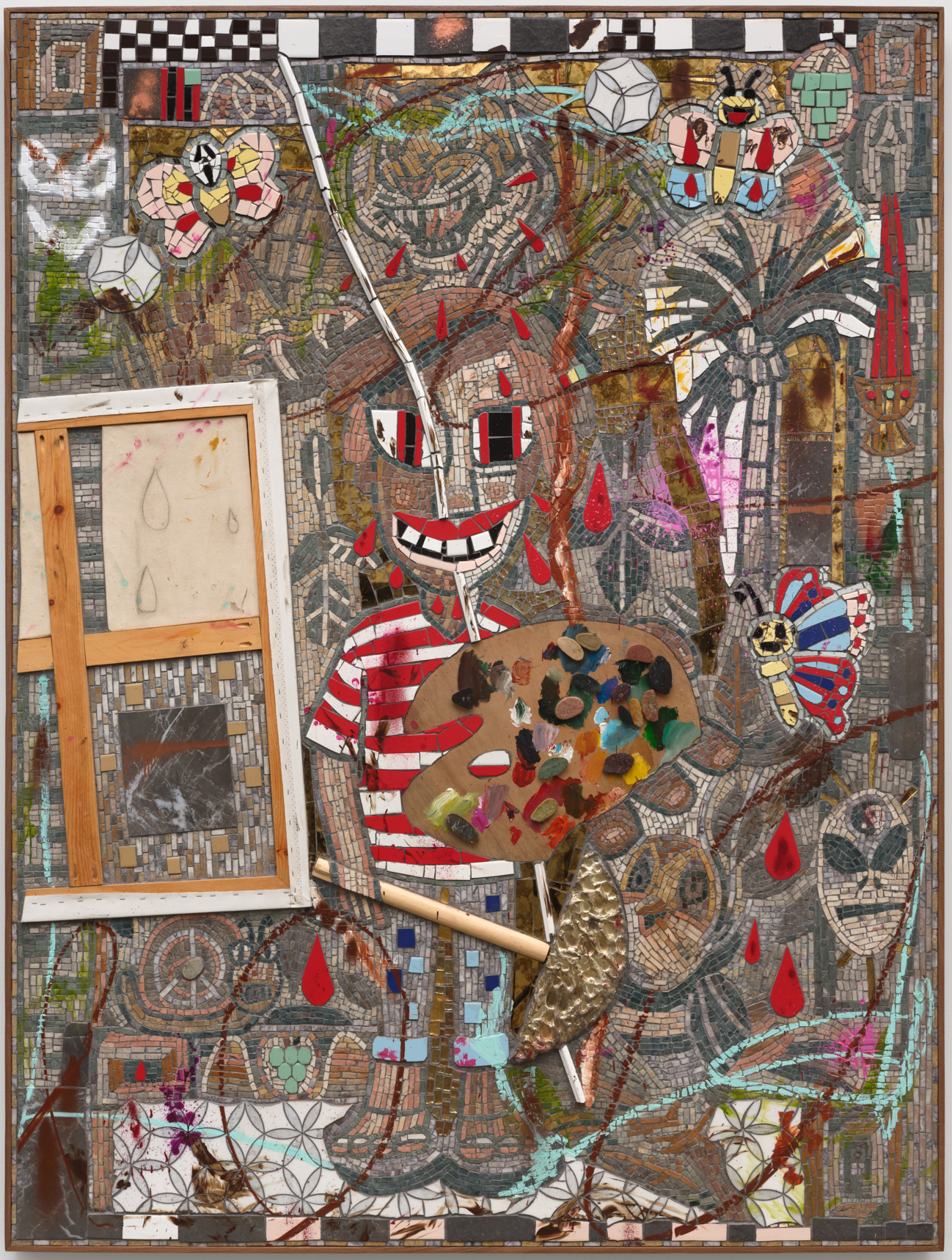 MARBLE, GLASS, CERAMIC, STONE, SPRAY ENAMEL, OIL AND ACRYLIC ON PANEL IN ARTIST FRAME