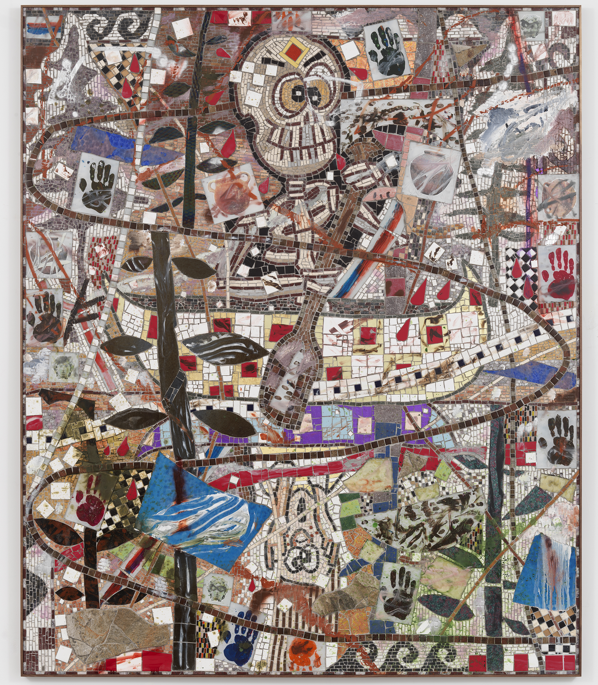MARBLE, GLASS, CERAMIC, STONE, SPRAY ENAMEL, OIL AND ACRYLIC ON PANEL IN ARTIST FRAME