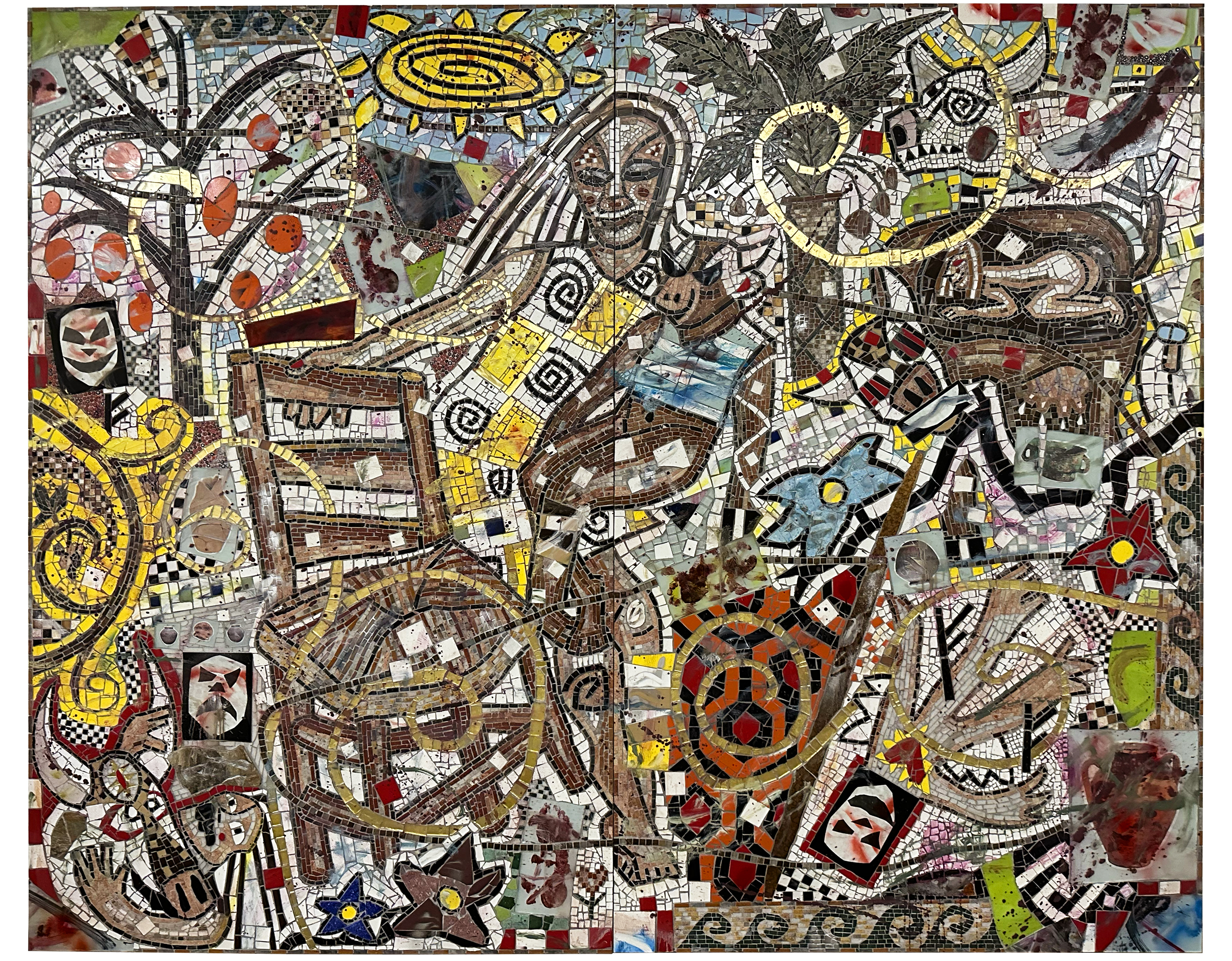 MARBLE, GLASS, CERAMIC, STONE, SPRAY ENAMEL, OIL AND ACRYLIC ON PANEL IN ARTIST FRAME