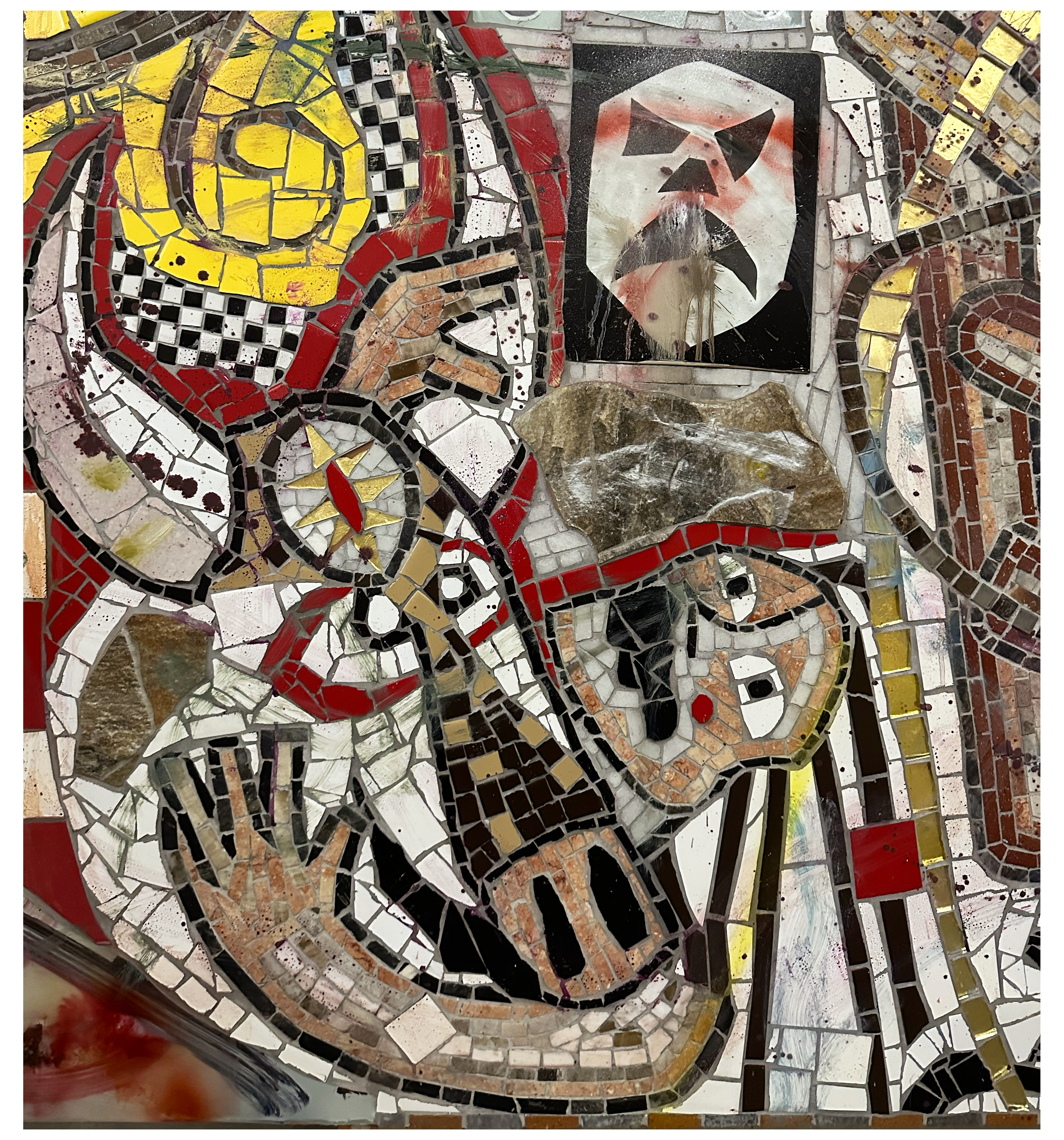 MARBLE, GLASS, CERAMIC, STONE, SPRAY ENAMEL, OIL AND ACRYLIC ON PANEL IN ARTIST FRAME