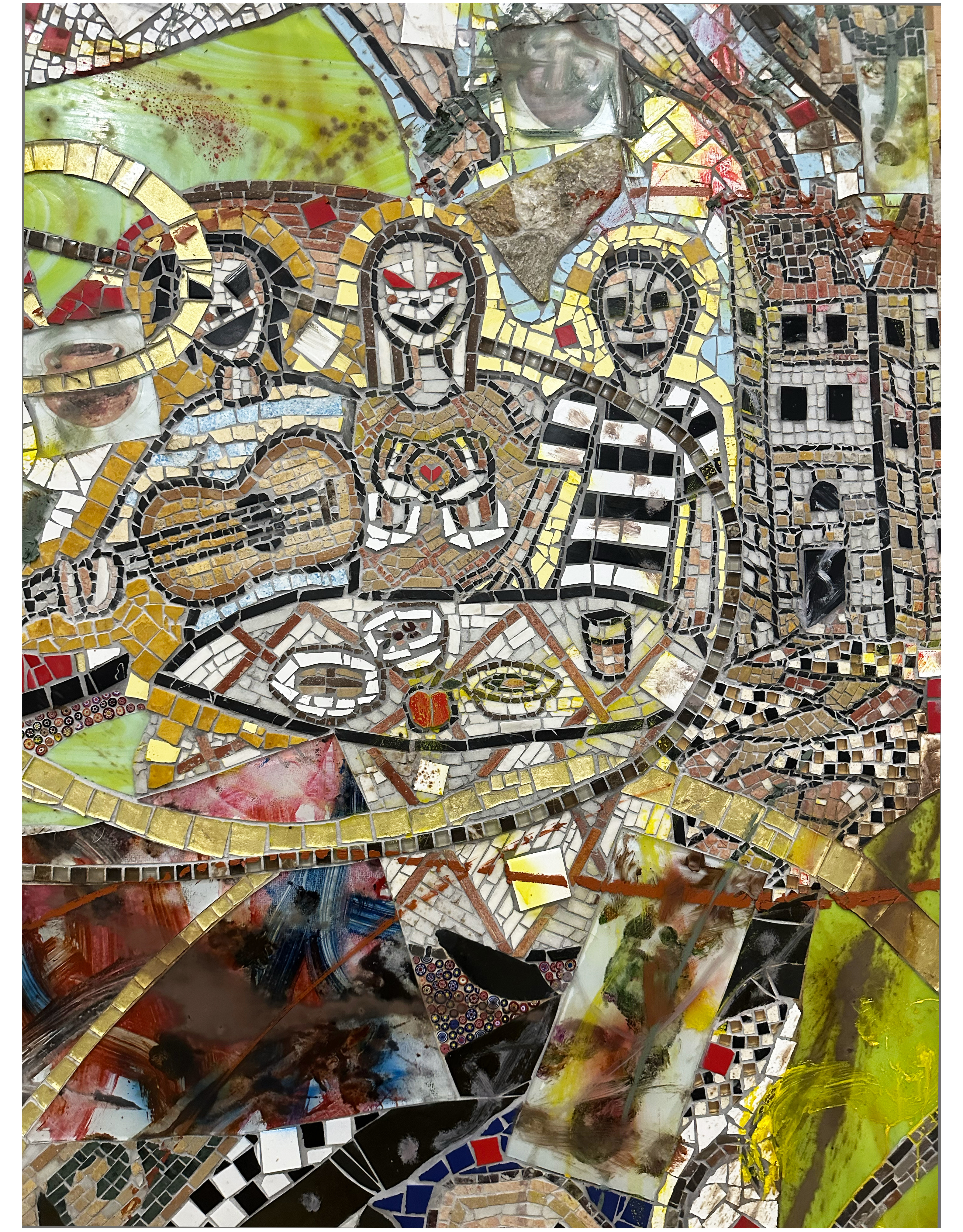 MARBLE, GLASS, CERAMIC, STONE, SPRAY ENAMEL, OIL AND ACRYLIC ON PANEL IN ARTIST FRAME