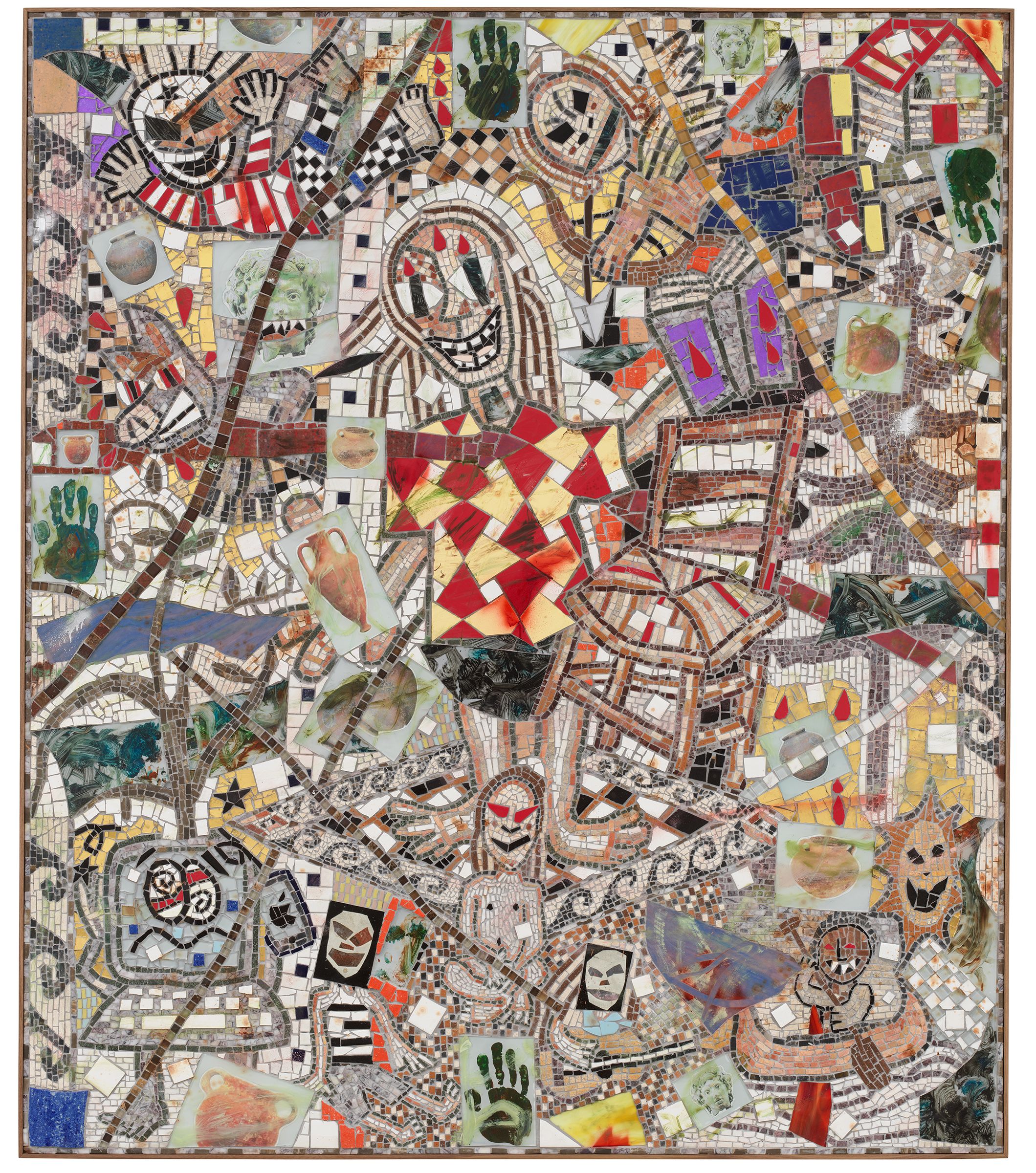 MARBLE, GLASS, CERAMIC, STONE, SPRAY ENAMEL, OIL AND ACRYLIC ON PANEL IN ARTIST FRAME
