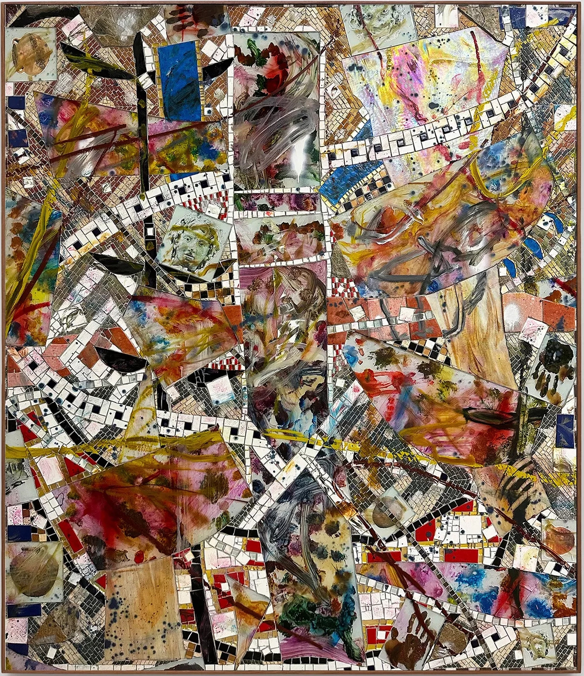 MARBLE, GLASS, CERAMIC, STONE, SPRAY ENAMEL, OIL AND ACRYLIC ON PANEL IN ARTIST FRAME